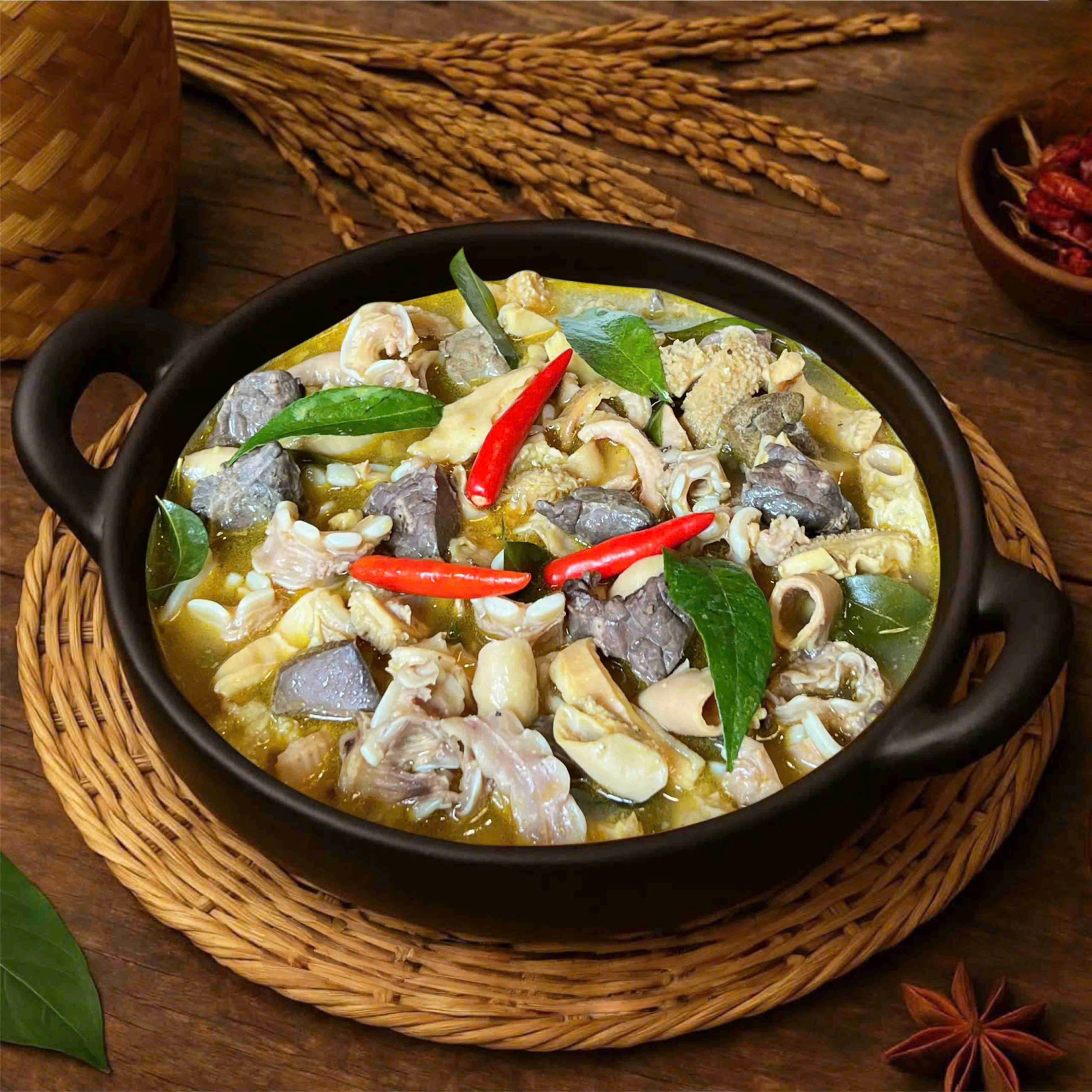 Thành phần chính: Lòng bò (>= 50%), thịt bò, nước dùng, thảo mộc đặc trưng (gừng, quế, đại hồi, thảo quả, nghệ), sả, lá mắc mật, hành củ, ớt, hạt nêm...